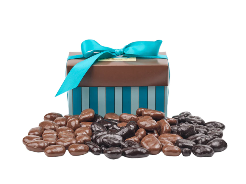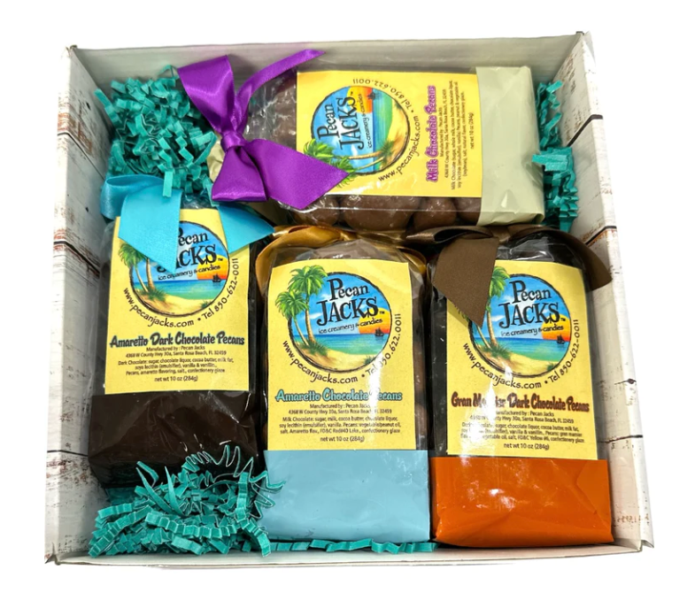 Selected from the very favorites of our very favorite customers! 4oz milk chocolate amaretto pecans, 4oz dark chocolate gran marnier pecans and 2 gourmet pralines.The PERFECT gift box for friends, family, your yourself!