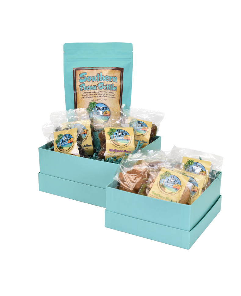 Our 2-Tier Medium Tower is a show-stopping gift filled with all your Pecan Jacks® favorites — handcrafted, irresistible, and perfect for sharing (if you’re feeling generous 😉).